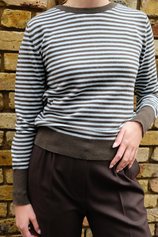 Our soft cashmere jumper celebrates stripes in all their glory.  With its contrast ribbing around the softly rounded neckline, hem and elongated cuffs this is a far cry from your everyday jumper.  A vertical seam on the reverse adds to its individuality, designed as a fitted shape that looks great worn with a skirt or trousers.