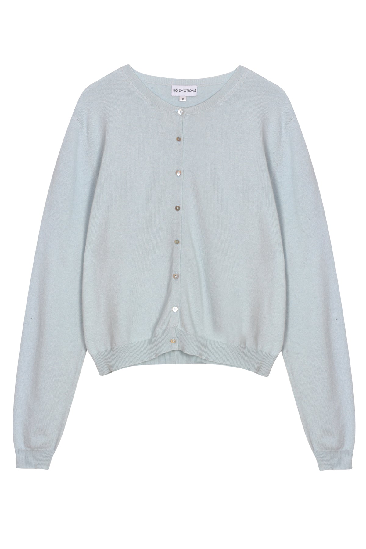 A relaxed crewneck cardigan in a soft cashmere lambswool blend, designed with ribbed cuffs and hem, and finished with mismatched mother-of-pearl buttons for a subtle 90s-inspired edge.
