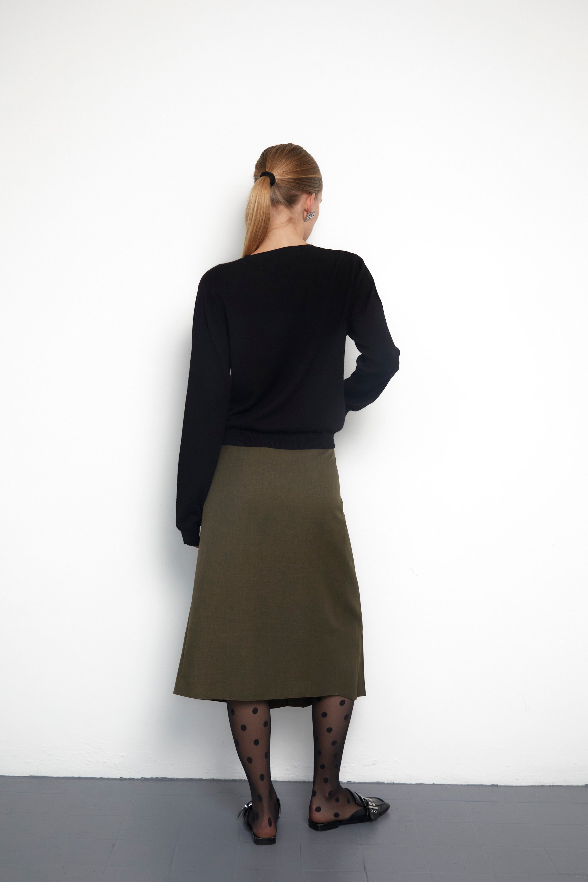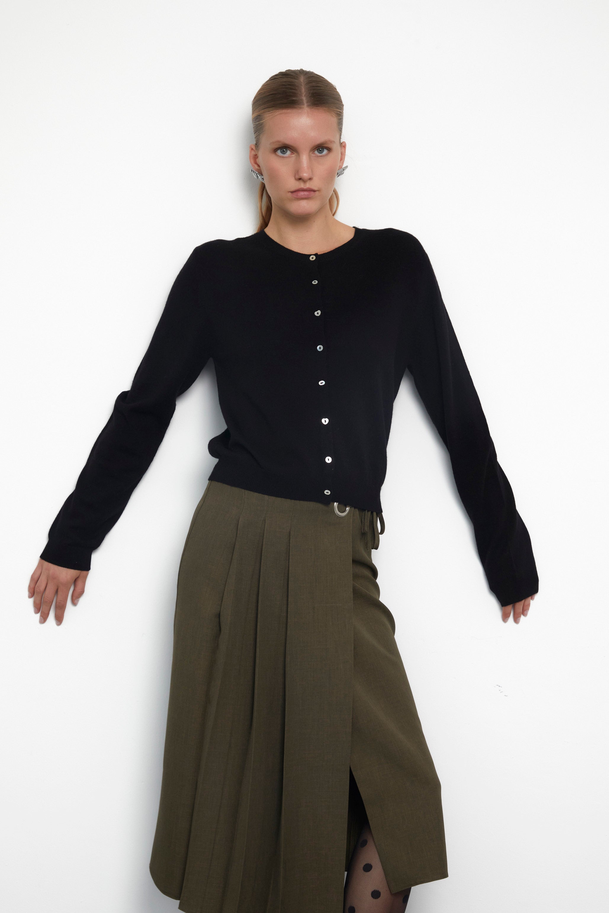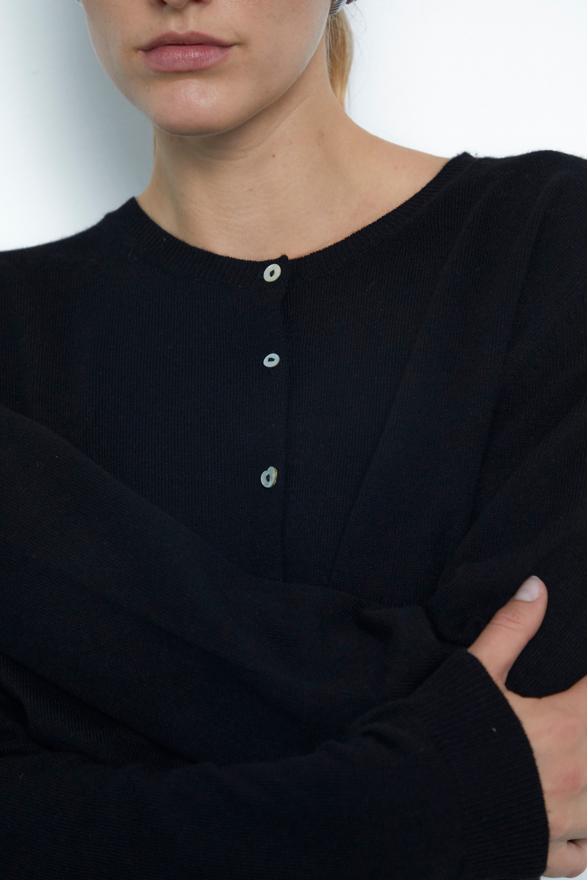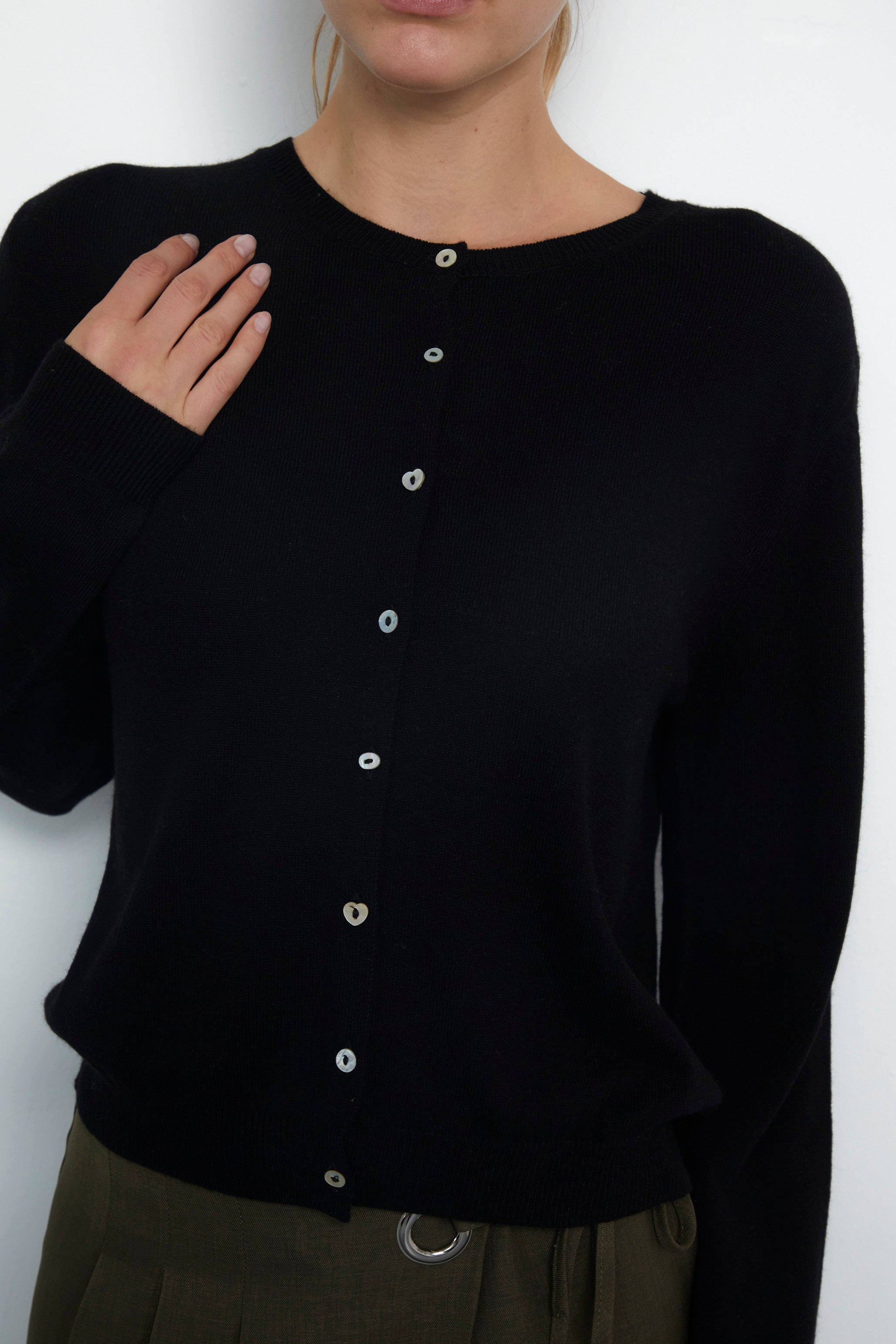 A relaxed crewneck cardigan in a soft cashmere lambswool blend, designed with ribbed cuffs and hem, and finished with mismatched mother-of-pearl buttons for a subtle 90s-inspired edge.