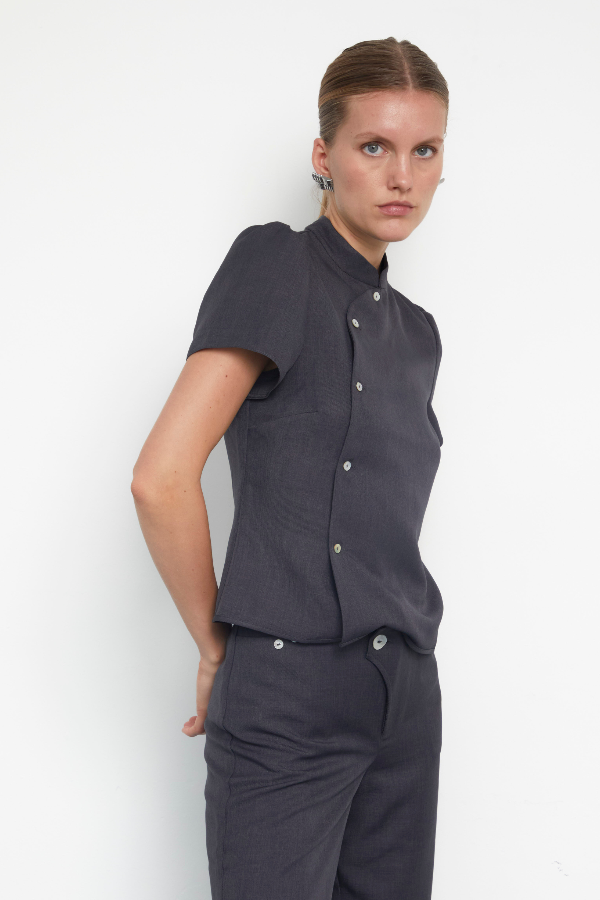 Elongate legs with simple, flat fronted trousers with carefully positioned mother of pearl buttons. Style with matching Claudia Top or wear solo as a perfect pair of neutral trousers.