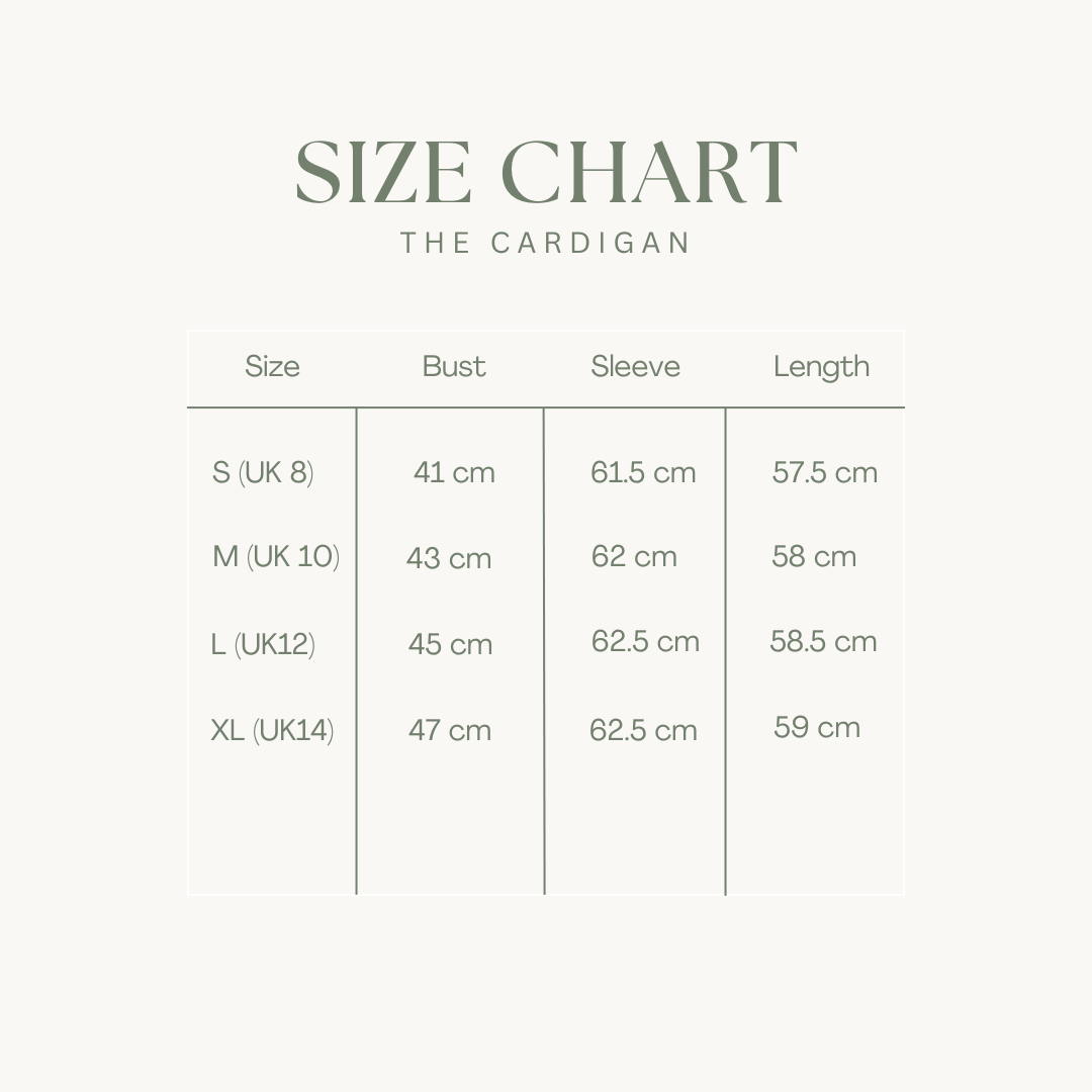 Our pieces are designed for a relaxed yet flattering fit. We recommend checking our detailed size guide for measurements and fit notes. If you’re between sizes or unsure, our customer care team is always happy to advise.