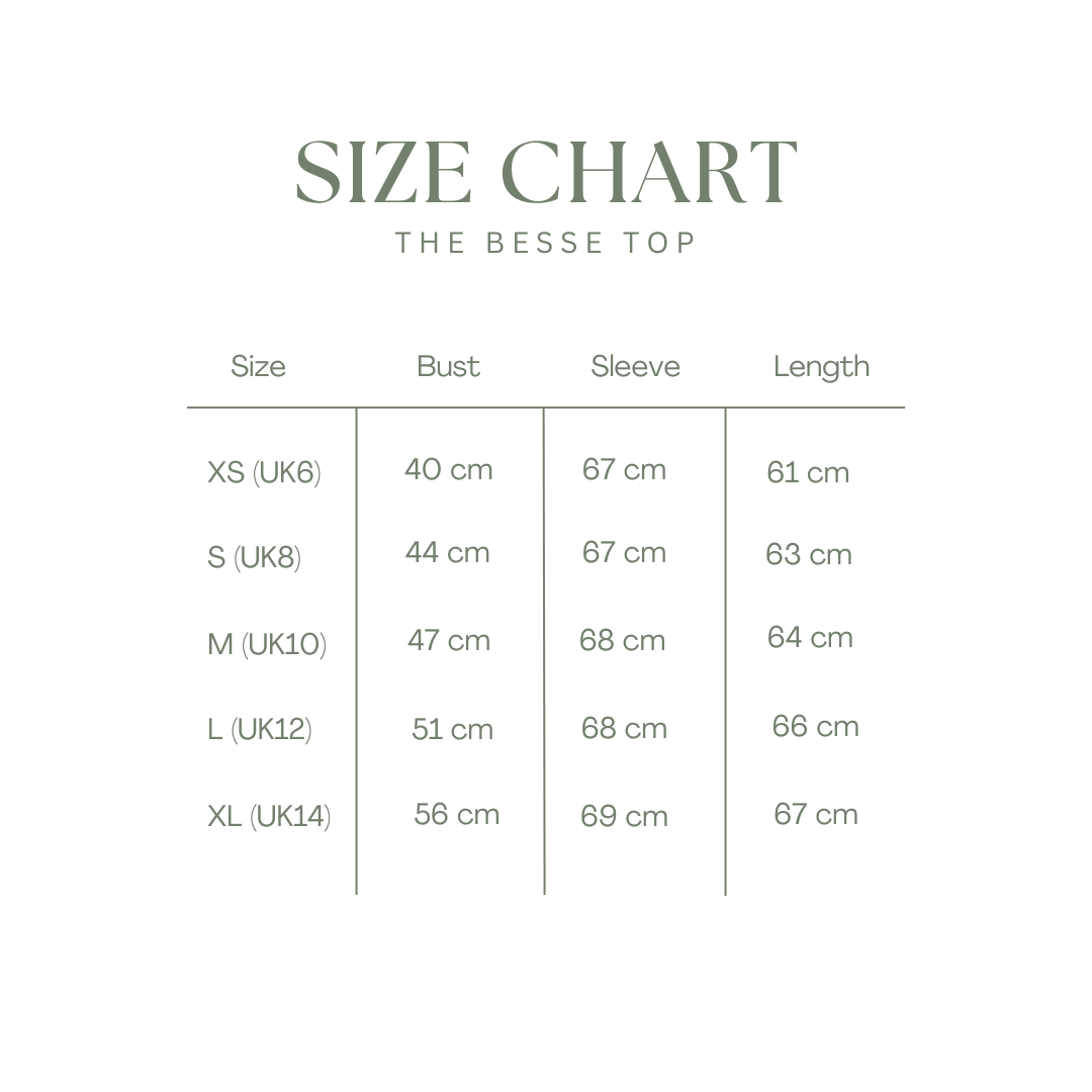 Our pieces are designed for a relaxed yet flattering fit. We recommend checking our detailed size guide for measurements and fit notes. If you’re between sizes or unsure, our customer care team is always happy to advise.