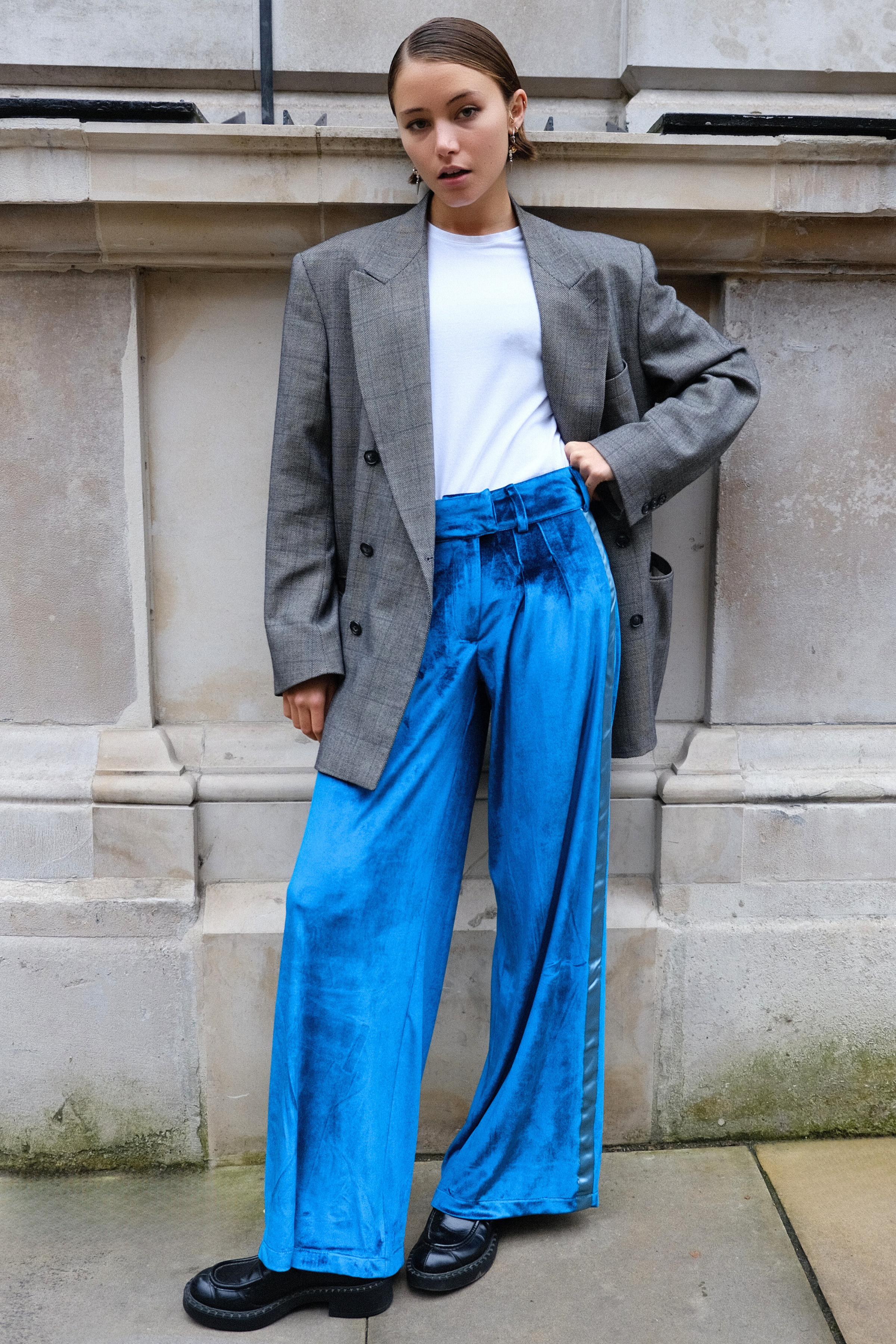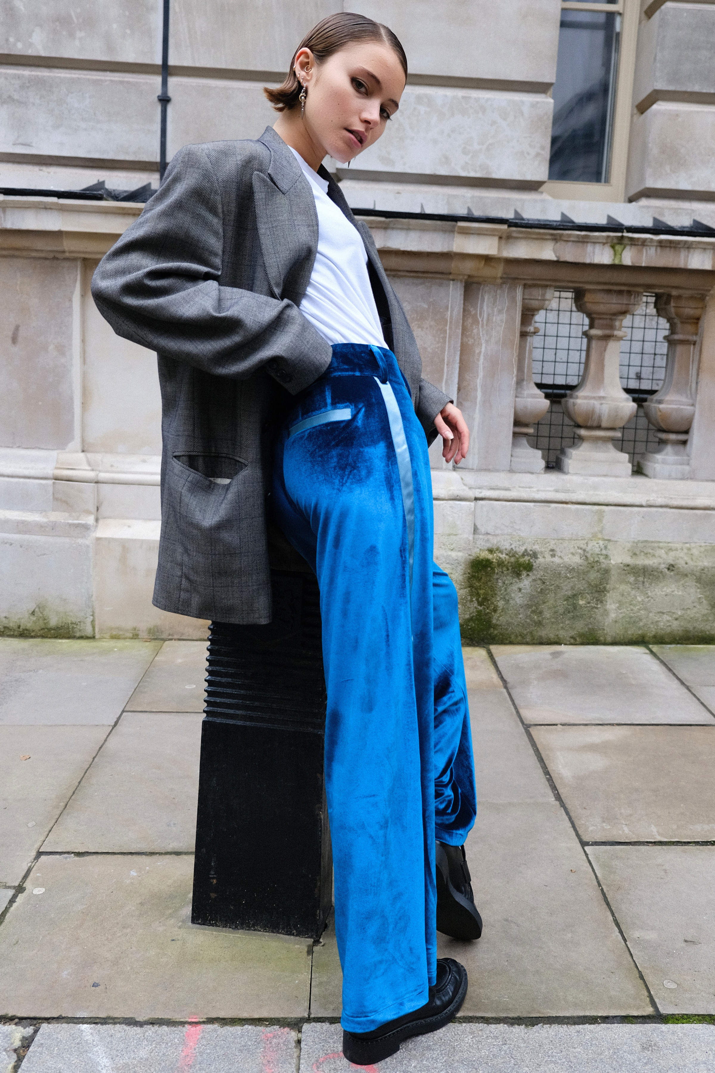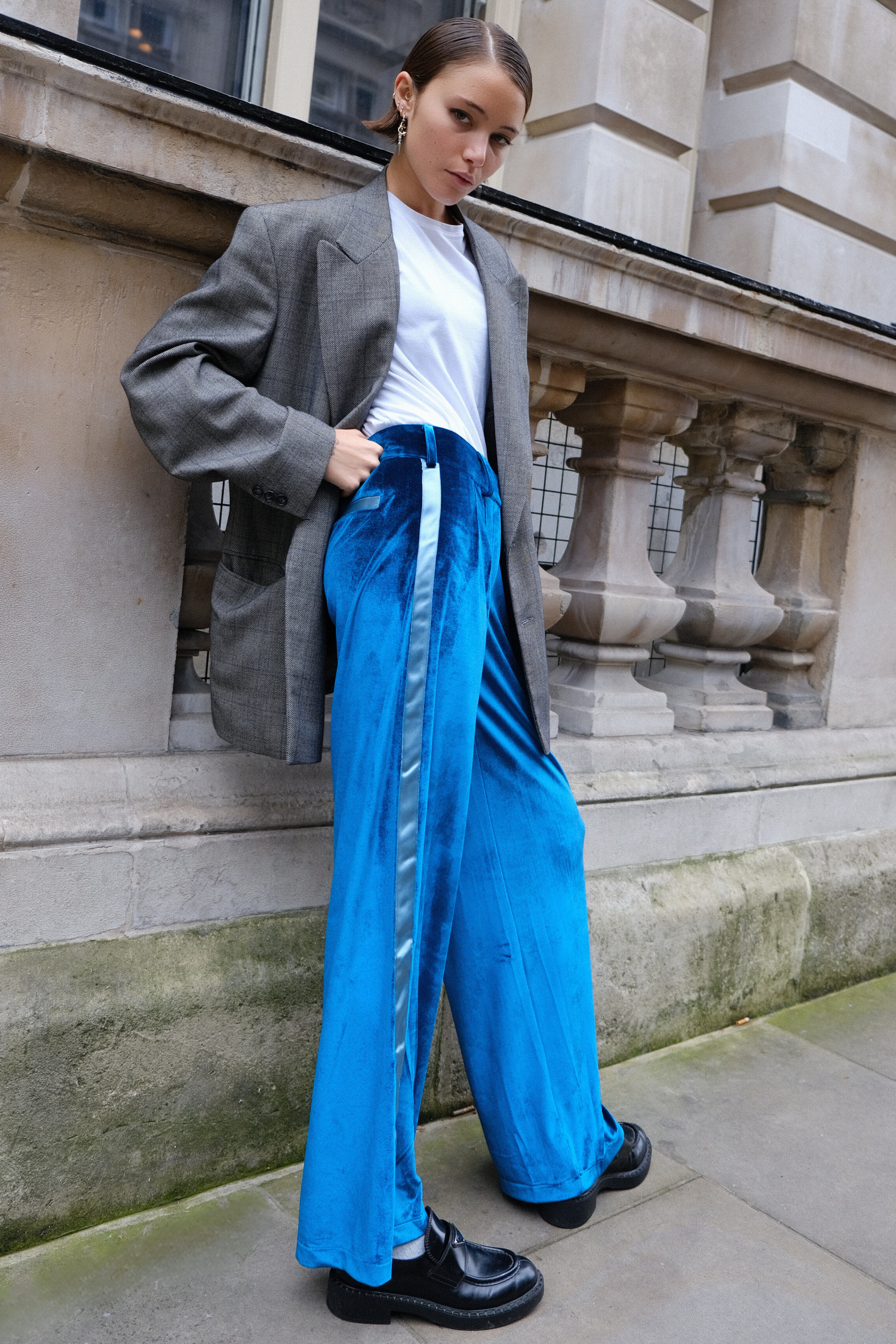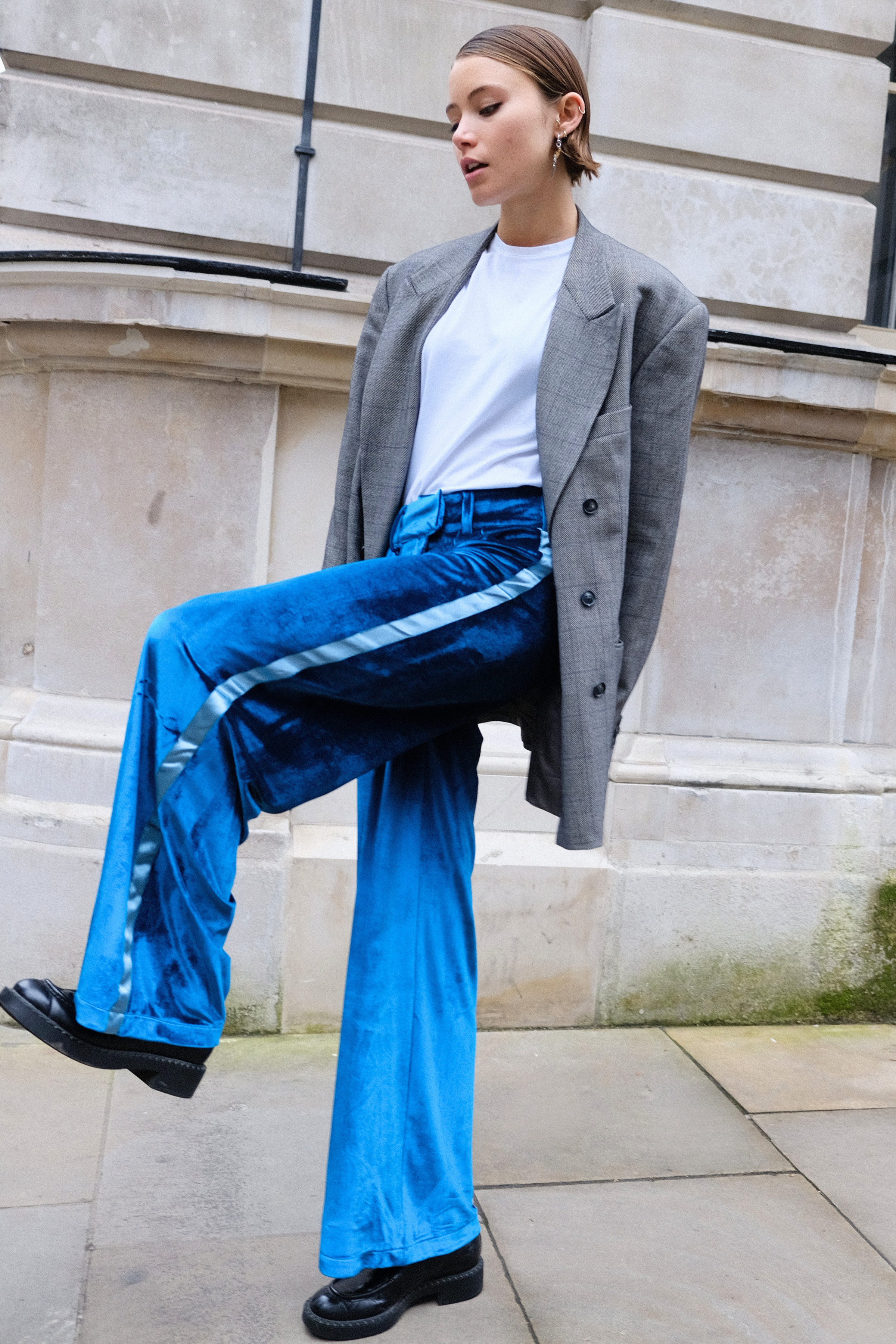 The key to endless legs: the signature NE side stripe now graces luxurious velvet. Blending elegance with a laid-back athletic vibe, the velvet trousers offer the solution to all your smart-casual wardrobe dilemmas. Complete with a statement waistband and double front pleats, they sculpt a silhouette that's flattering, fierce, and forgiving all at once.