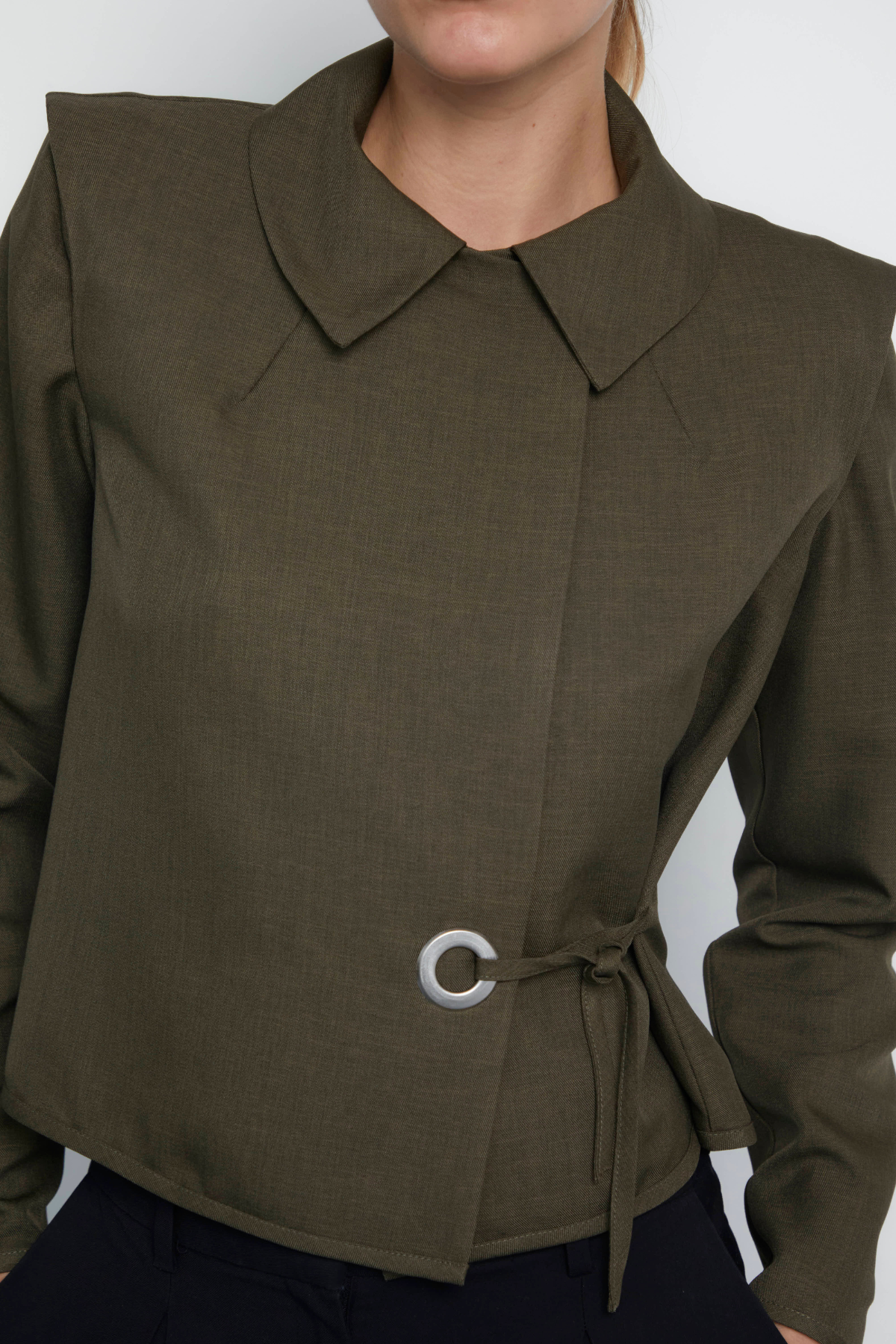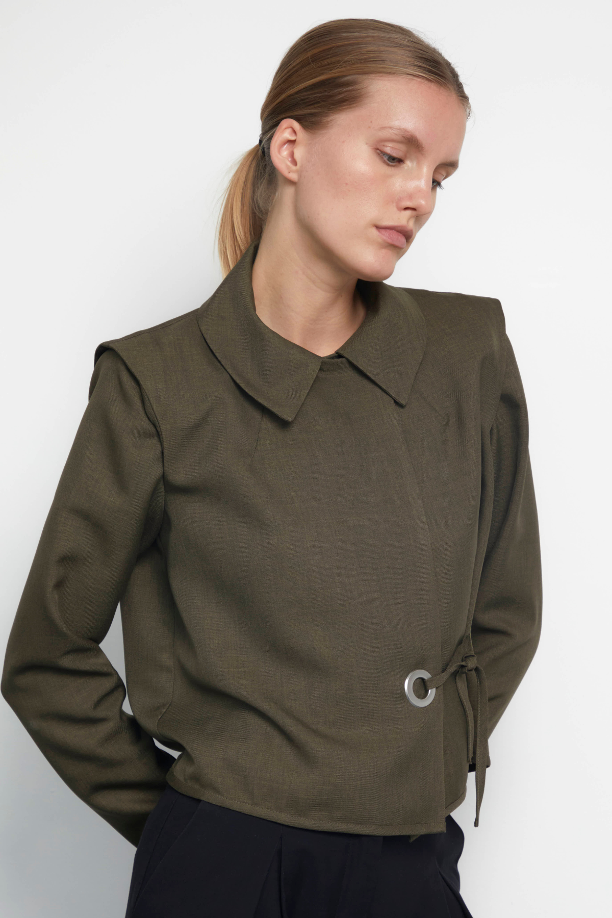 With sharp structured shoulders and boxy design this jacket is as good over trousers as it is with The Kate Kilt. An oversized collar, eyelet tie detail and classic shape make it an Autumn Winter staple.